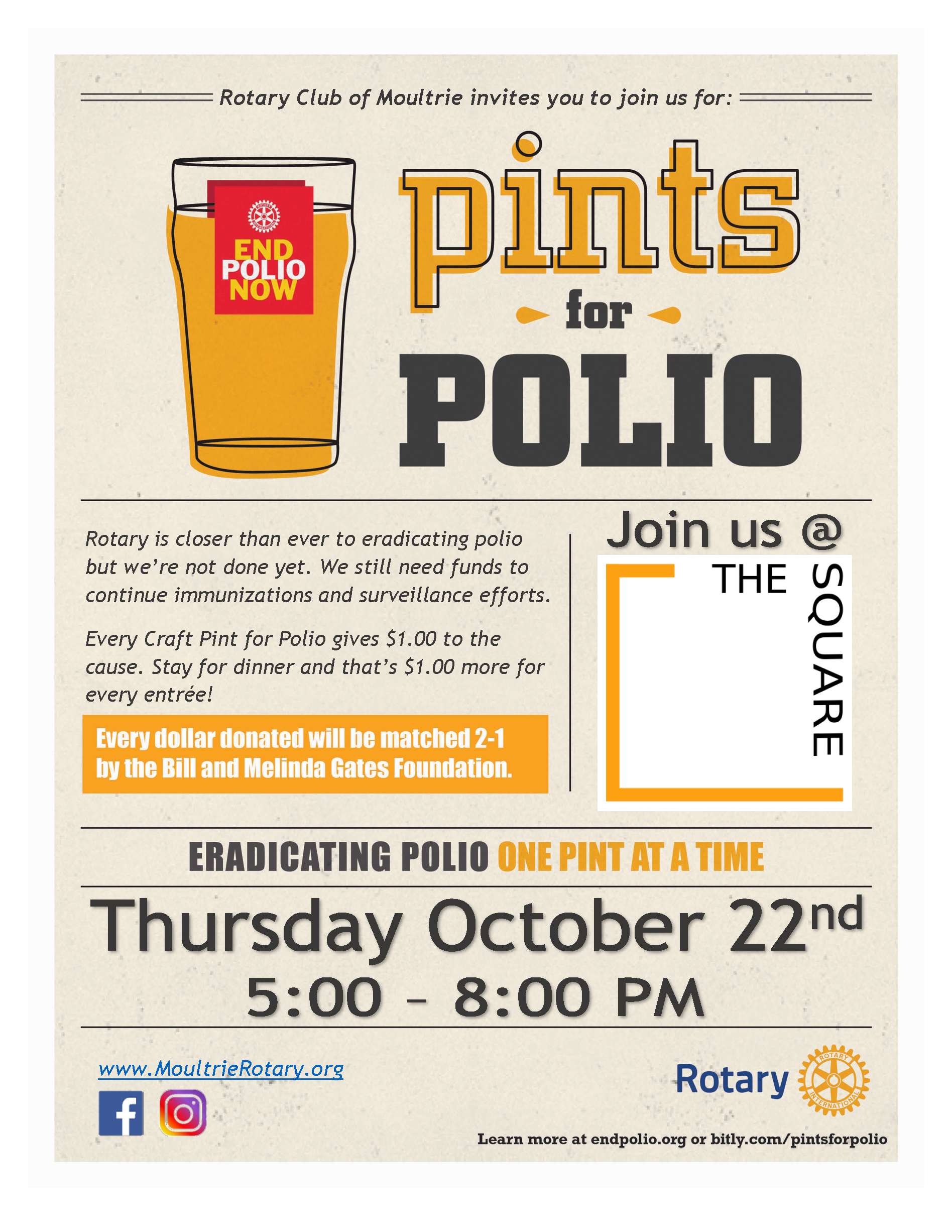 The Rotary Club of Moultrie held its 2nd Annual "Pints for Polio" event to raise funds and awareness for the eradication of polio. On the Thursday before World Polio Day, Rotary members gathered to eat, drink, and be merry in support of the End Polio Now movement. For every pint purchased that night - and for every plate of food ordered - The Square Restaurant contributed $1.00 to the cause. Not only did we raise money for a great cause, it was also good for public image - we had at least 5 individuals inquire about Rotary and what we do, and 1 of those has joined as a member! This event was also registered on EndPolio.org as a World Polio Day event.